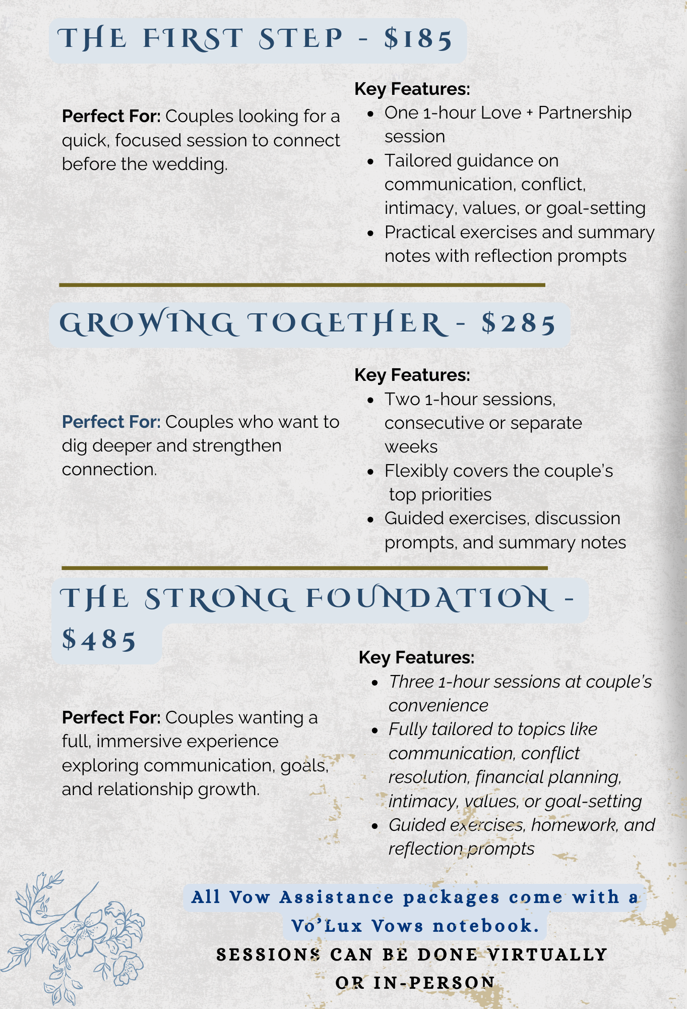 At the heart of every relationship is a space to grow, laugh, and lean on one another. Love and partnership aren’t about perfection. They’re about showing up, being seen, and choosing each other every single day. Every partnership has its own story, and this is your space to honor it. These sessions are designed to help you connect more deeply, communicate more openly, and celebrate the love you share. Step into a session filled with understanding, warmth, and guidance—and leave feeling even closer to one another.