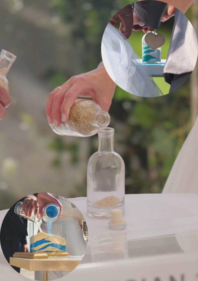 Pour your hearts into one. In the sand ceremony, each partner adds their colored sand to a single vessel, blending your unique paths into a beautiful, permanent keepsake that reflects your love story and the life you’re building together.