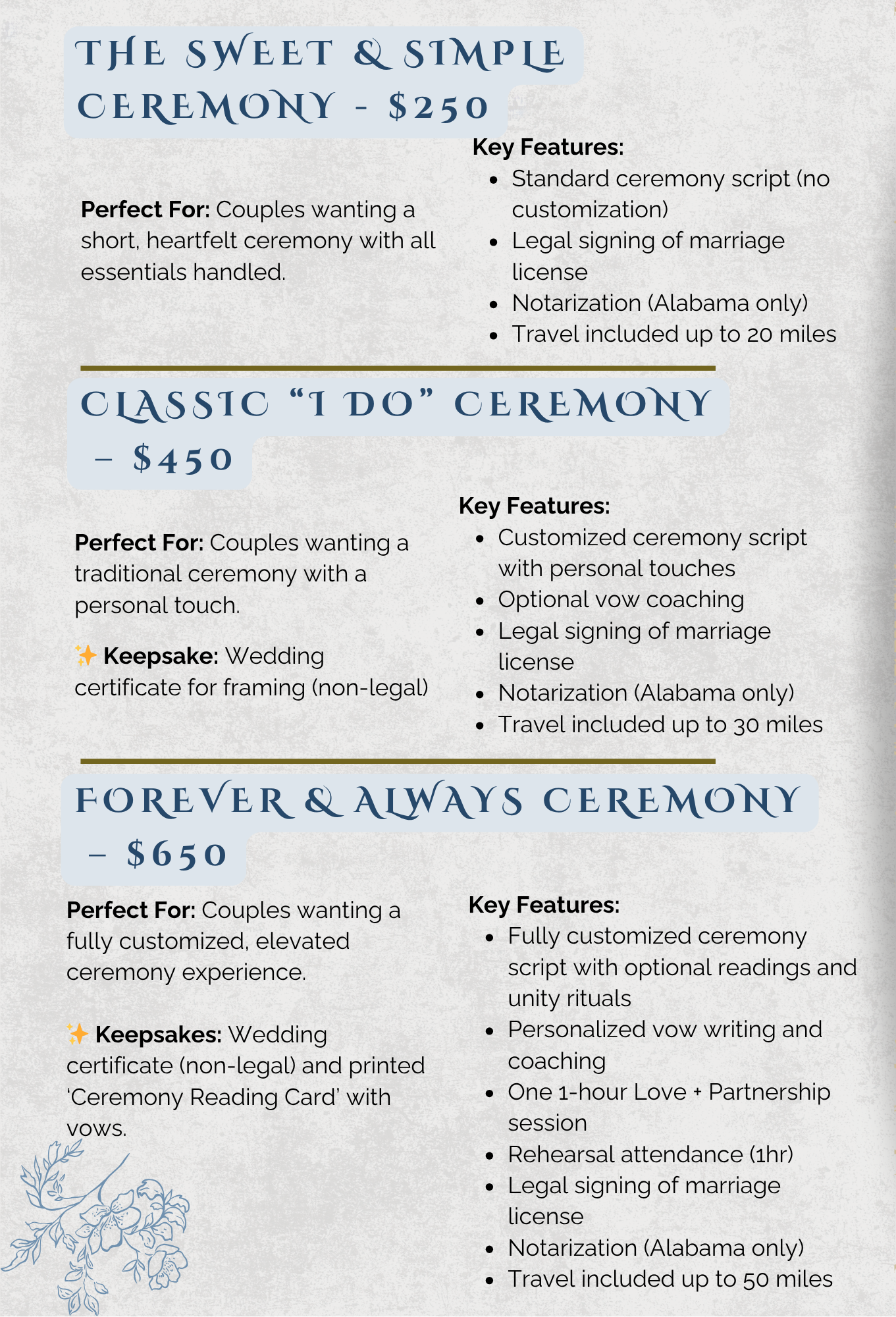 Your wedding day is a chapter you’ll carry in your heart forever, and the ceremony is where it all begins. As your officiant, I hold the honor of guiding that sacred moment with warmth, grace, and care. Whether your vision is timeless and traditional, spiritual or non-religious, modern or uniquely your own, every love story deserves to be celebrated. I joyfully officiate ceremonies for all couples, honoring love in its truest form—without limitation. My role is simple but profound: to create a ceremony that feels deeply personal, filled with intention, and worthy of the promises you’re ready to make.